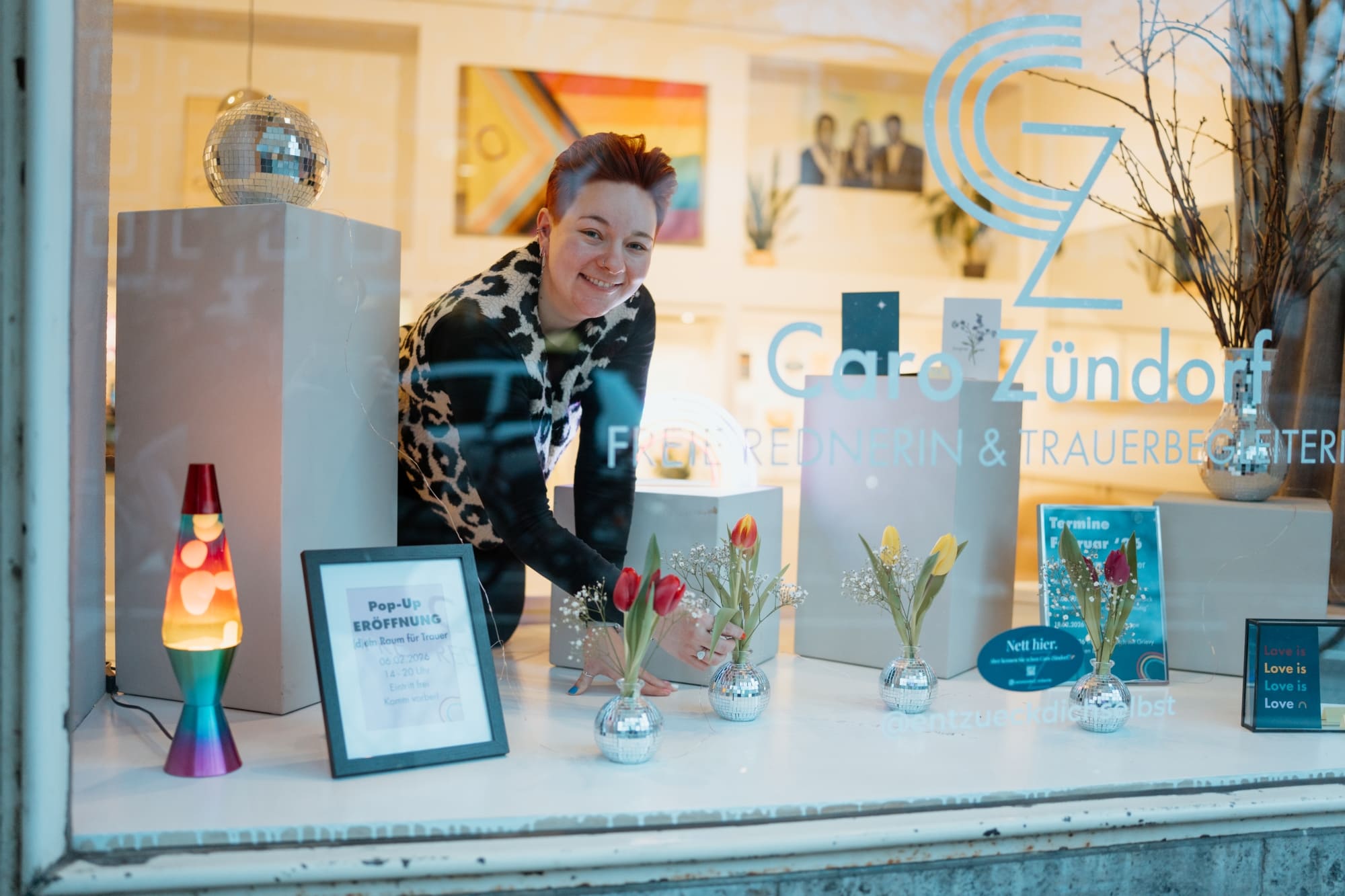 Ich begleite Menschen und ihre Zugehörigen bei Abschieden und Trauerfeiern. Ich möchte die Themen Trauer und Verlust mehr in die Mitte der Gesellschaft holen, weil diese viel zu wenig besprochen werden und öffentlich stattfinden. Insbesondere für die Menschen der LGBTQIA+-Community möchte ich einen Safer Space schaffen und biete deshalb eine queere Trauergruppe an. Ich veranstalte in meinem Pop-Up-Laden aber auch Lesungen, Musik-Abende, Workshops und einen Traueraustausch.