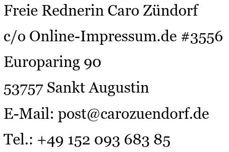 Alle Rechte vorbehalten. Text, Bilder, Grafiken, Sound, Animationen und Videos sowie deren Anordnung auf den Websites der Caro Zündorf unterliegen dem Schutz des Urheberrechts und anderer Schutzgesetze. Der Inhalt dieser Websites darf nicht zu kommerziellen Zwecken kopiert, verbreitet, verändert oder Dritten zugänglich gemacht werden. Einige Seiten der Caro Zündorf Websites können außerdem Bilder enthalten, die dem Copyright Dritter unterliegen.